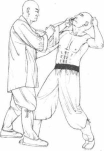 5 我方左拳向前一顶右手凤眼捶紧跟而出点击其人中穴。(图2-14)