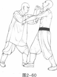 2 随即左脚前移步于敌方右脚外侧同时右掌贴着敌右腕内侧向外格化左掌向前反背掌打其面门。(图2-60)