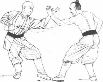 1 敌方滑步进身左掌劈击我方面部。我方后滑步避敌掌锋芒之际左掌上扬旋格敌左腕内侧。(图4-40)