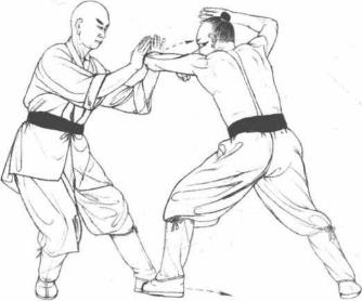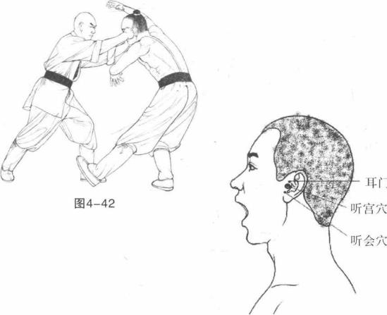 3 动作不停我方两掌猛力下按敌左肘左脚进步两掌抖劲成凤眼捶向前夹击敌左右听宫穴。(图4-42)