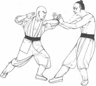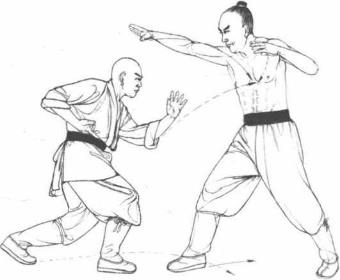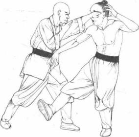 用法1 敌方左脚前移步右脚向前跨上一大步右掌横扫我方头部。我方迅疾向后滑退半步左脚向后撤退一步沉身下蹲避过敌掌锋芒。(图4-43)2 4-434-43随即我方左脚向前跨上一步同时左肘顶击敌方心口。敌方右脚收步仰身之际双掌相并阻截我左肘4-434-433 动作不停我方左臂伸肘剑指反划点击敌左侧太阳穴。(图4-45)图4-45图4-45附图穴位太阳穴为经外奇穴。在耳廓前面前额两侧外眼角延长线的上方。是武术死穴之一。现代医学证明打击太阳穴可使人短暂晕倒或造成脑震荡使人意识丧失。