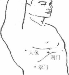 用法1敌方左脚前移步右脚向前跨上一大步右拳击打我方胸部。我方后滑半步左脚后撤一步同时右掌下按敌方右前臂上侧掌根抖劲震落敌方攻击拳。(图5-18)2随即我方左脚跨进一步绊于敌方右腿后侧同时左手成爪按向敌方左肋中指尖点按敌方左期门穴。(图5- 19)图5-19穴位期门穴属肝经亦为肝经募穴。位于胸部当乳头直下第6肋间隙前正中线旁开4寸。有腹直肌肋间肌有肋间动、静脉布有第6、7肋间神经。