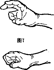 7 阴拳拳心向下为阴拳。点穴术中的拳最好用虚拳(实拳也可。拳是由掌卷握而成它的握法是五指微开再卷屈成钩状手心空虚手背紧绷拇指扣在食指的第一指骨上劲连于臂(图8)。阴拳可击打脐部以上的穴位。如上、中、下三胱等穴位。