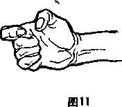 9 空心拳五指微开卷屈而成中指末节突出拳面拇指紧扣中指指甲处手心空含(图10)空心拳多以阴拳出现可点脐部以上穴位。如印堂、人中、鸠尾、巨厥等穴位。