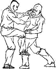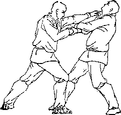 1乙用其右手从正面抓甲脖领甲撤右脚体向右扭甲右手按住乙右手防乙撕破甲的脖领(图106)。2甲左手用中、食二指点乙的上胱穴同时重心前移(图107)。