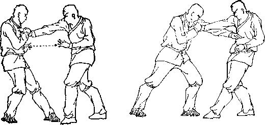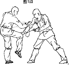 2甲左手接着盖压乙的右手甲右手抽回用阴拳猛击乙的中肮穴同时右脚落地进身相助(图105)
