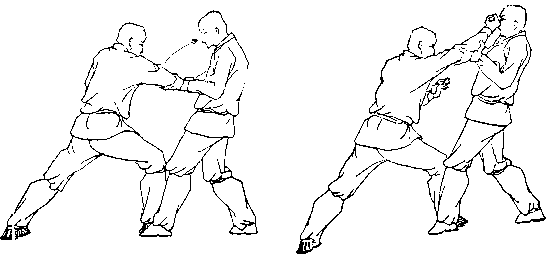 图113图113图114图1141甲上右脚用右肘去顶碰乙胸部时乙撤右脚用其双手来接(图113)。2甲用右拳反背去砸乙的鼻梁穴同时进身相助(图114)