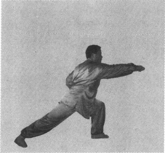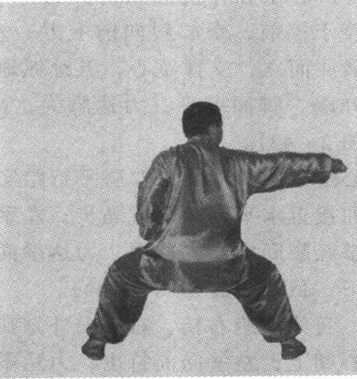 身体重心落于两腿中间,双脚平行踏实,脚尖朝 前,大腿屈曲接近水平,两腿成马步;左手不动,拳 心朝上;右拳经腰间向侧方冲出,力达拳面,与胸同 高,拳心朝下;目视右方(图2-44)。