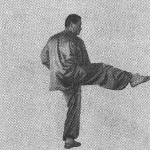 图 2-42图 2-42上势不停。右手在体前按顺时针方向划圈反砸, 手臂微屈,停于裆前,拳心斜向前上方;左手不动; 同时,左腿微屈而立,支撑重心,五趾抓地;右脚迅 速提起向前弹踢,脚面绷平,力达脚尖,高不过裆; 目视前方(图2-43)。