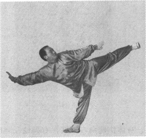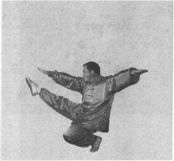承上势。身体起立略向右侧倾,以右脚为中心支 撑体重,大腿挺膝伸直,全脚掌着地;左脚疾速提起 向左侧方踹出,力达脚掌,脚与头同高;同时,双手 向两侧伸展,左高右低,掌心朝外;目视左方(图 3-41)o