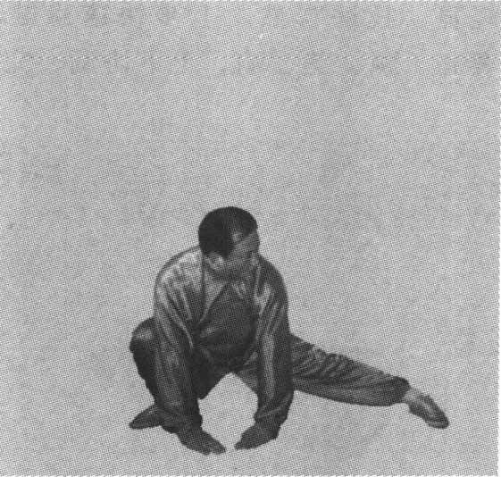 接上势。左脚先落下着地,大腿侧伸仆平;接着 右脚向前迈出一大步落地,两脚全脚掌踏实,大腿屈 曲下蹲,两腿成左仆步;同时,双手以掌心为力点, 由体前向下拍击地面,前臂略屈,手指略朝前;目视 左方(图3-39)o