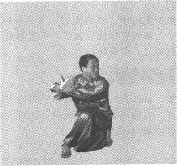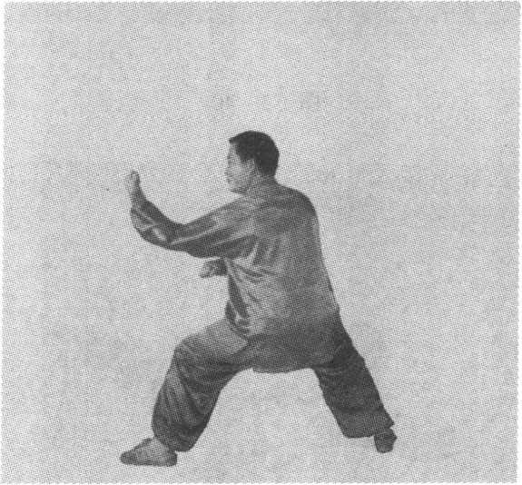 图 3-39图 3-39接上势。身体快速起立,重心移至左脚,左脚不 动;右脚向左脚后插步,前脚掌着地,脚跟提起,两 腿屈曲下蹲成右歇步;同时,双手以肩关节为轴向外 环绕,于胸前交叉,头向左转;目视左前方(图 3-40)