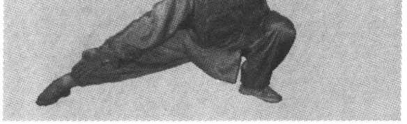 图 3-44图 3-44接着,身体以腰为轴快速右转,重心降低;左腿 屈曲下蹲,大腿与小腿相贴靠;右腿向侧方挺直平 伸,脚尖内扣,两脚全脚掌着地,成右仆步;左手经 右前臂向斜上方钻出,右掌朝下方穿出,双手立掌, 头向右转;目视右掌(图3-45)。