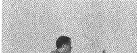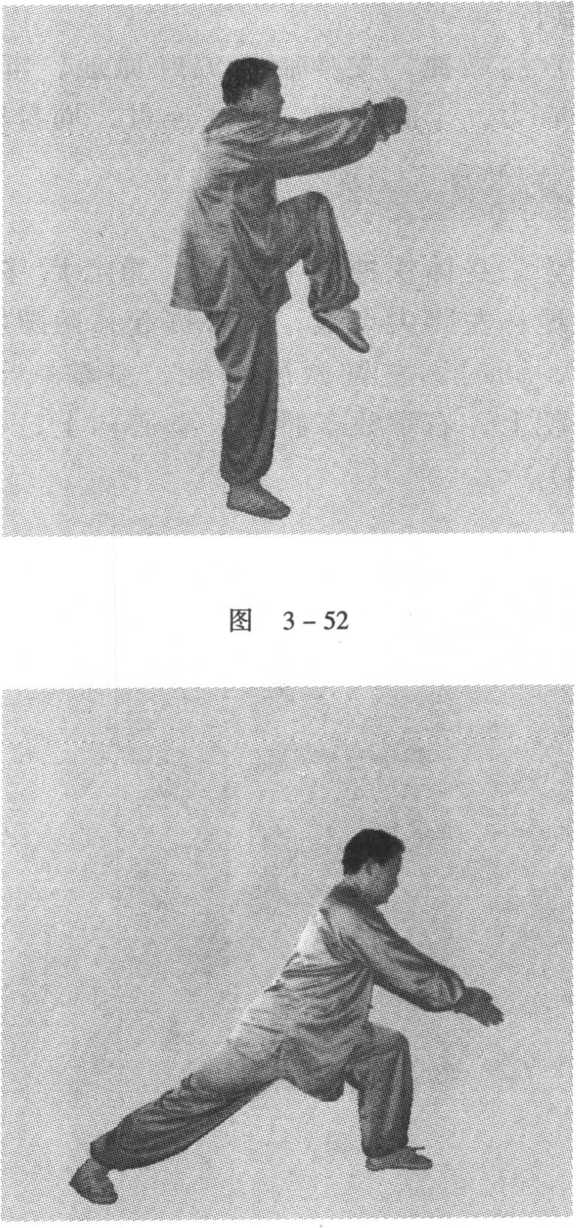接上势。身体正直朝前,右脚快速向前上步,全 脚掌着地,脚尖略外撇,支撑体重;左腿随即屈曲提 起,脚尖朝下护于裆前;双手变拳,从两侧向内合 击,臂微屈,拳心朝内,与耳部同高;目视前方(图 3 -52)O