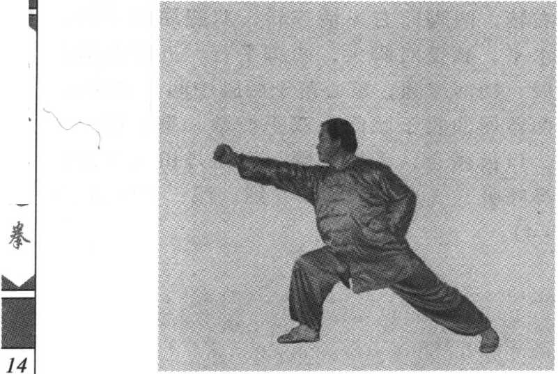 接着,身体左转,双腿成马步;然后,再向左方 做劈拳动作。动作循环不已,连续演练。