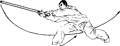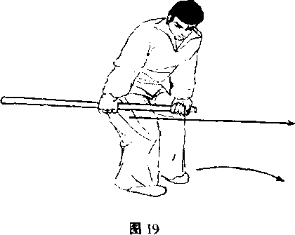移,随势两足跟微提起;在身体前弓、重心后坐、两足趾根同时 前蹬,全身后滑,双手借身体后滑之力将鞭梢向身后用力蹴出。 (在双手握鞭向后蹴之即,左手速脱把并与右把前相靠抱鞭谶出, 方能劲顺力到。)(图19)