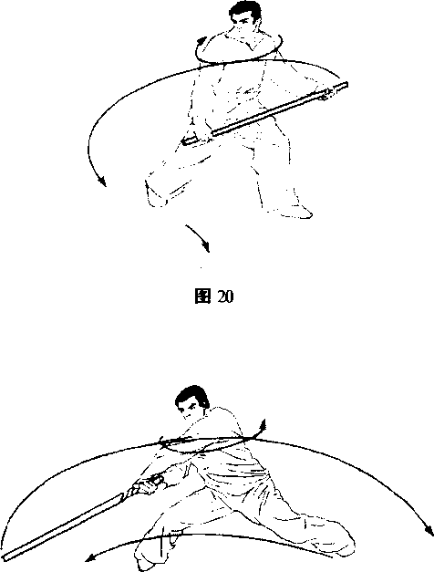 (2) 接上势,右步蹬伸,身体重心前移于左腿,右腿在向左 前过步的同时,以右手握鞭把为支点,以左手松握鞭梢为力点, 身体向右拧转左手将鞭梢向右前侧扇剃,扣击。(图20)