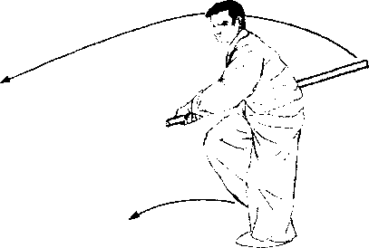 (1)接上势(图25)中,上动中向前将鞭梢横扫于身体正 前,顺势右步前蹬,身体重心左移,同时右步后撤,右手松握鞭 身为支点,左手为力点将鞭抽向身体左侧后不停,继而将鞭把由 左向身体正前拧身反扣劈,鞭把击地。(抽鞭、撤步、拧身反扣 劈等一系列连续动作,要蹬伸有力快捷,含胸拔背,舒腰展臂, 大开大合,交手换把要自然明快,身械协调一致,一气呵成。眼