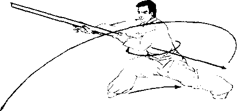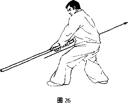 (3)接上势(图24)中,上动中身体重心于左腿,接右步 前上之力,以左手阴手握把为支点,以右手松握鞭身为力点,向 前将鞭梢横扫于身体正前。势成右前弓步,眼视鞭梢,身体重心 于中,左腿微屈膝虚步后蹬。以上动作上步要稳,出杆要快速有 力,身械协调一致。(图25)