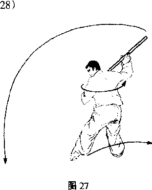 (3)接上势(图27)中,上动势成右腿屈膝身体微下蹲, 重心于右腿,左腿虚步前点;即时左腿后撤,身体向左拧身转 步,同时以左手阴手握把为支点,以右手阴手扣把为力点将左把 回拉后抽,右把向正前翻劈砸并击地。眼视正前。以上动作身械 协调,连贯明快一致,交把换手要自然,劈砸要迅猛有力。(图