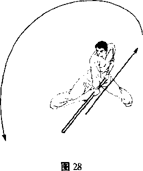 接上势(图28)中,顺势右腿蹬伸,身体重心上提,右腿 向右后撤步的同时,以右把为支点、左把为力点将鞭向身体左后 抽,鞭不停;继而以右把为支点、以左把为力点将鞭向身体正前 翻劈砸击地。眼视正前。(图29)
