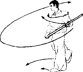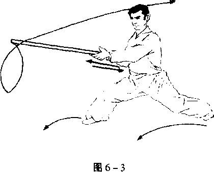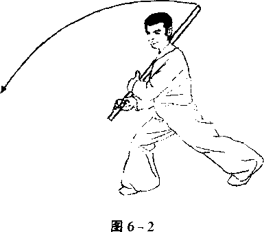 (2) 接上势,顺势以右手握把为支点,以左手松握把为力 点,在鞭子向右肩后搬的同时,身向左拧转,右肩前送,振臂抖 腕,含胸拔背,重心微下坐,将鞭前送,稍向前下劈点。以上动 作要快速连贯,身械协调一致,震臂抖腕要灵活自如有力,一气
