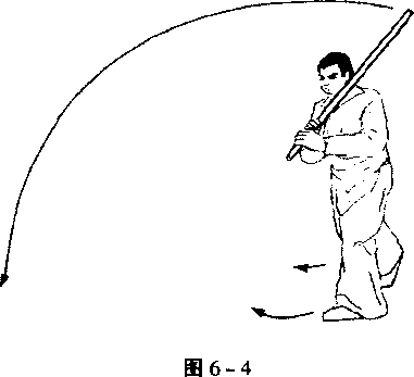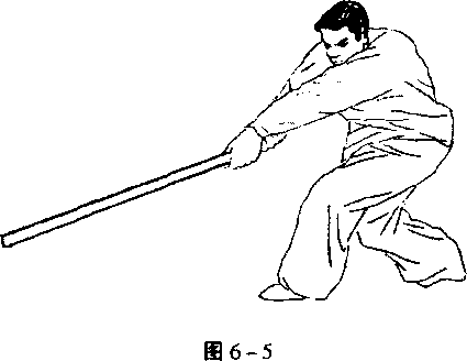 (5) 接上势,上势双手顺把抱鞭,鞭担于左肩的同时,右步 微侧点半步,左步同时前上,双臂向前下将梢劈点。在劈的同时 要含胸拔背,伸腰展劈,松肩推肘送腕,腕要松活自如。动作要 身械协调一致,迅猛连贯流畅,力求一气呵成,整体劲发。(图 6-5)