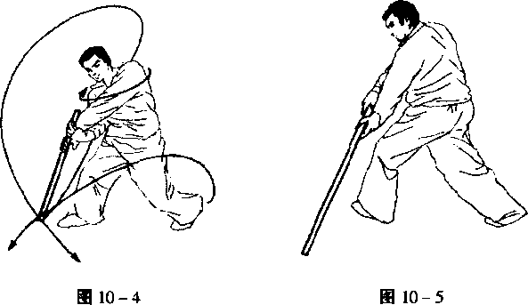 (4) 接上势,上势不停,顺势左腿微蹬,身体重心上提并向 右拧转的同时,右步随即向身体右侧前过步,同时以右手阴手握 把为支点,以左手阳手松扣把为力点,借身体向右拧转之力将鞭 梢迅速向右侧身前反扣臂击地(扇)。势成:右腿前微弓于右前, 左腿微屈膝虚步点地于左后。身体重心于右腿;含胸拔背,双臂 身体前相交,左臂上阴手扣把,右臂下阳手扣把。两手腕相扣相 交。眼视前下。(图10-4)