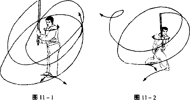 以上演练要拧身转时灵活快速,双手腕相扣相交,在左右上 下翻腕转小臂时要灵活协调一致,才能在鞭梢左右扇扣,劈击时 产生力的效果。节奏要明快迅猛连贯,步随意走,意随心变,心