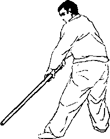 (8) 接上势,上势不停,身体重心上提,右腿向身体右后撤 步,同时身体向右拧身转体,并以右手握把为支点,以左手松握 把为力点,将鞭梢向正前劈砸击地(不击地也可,发暗劲)。左 手并顺势前滑于右手握鞭处附近。在向正前劈砸的过程中,必须 要吞胸拔背,伸腰舒臂,松肩推肘,展臂活腕;蹬伸要灵活,劈 击要有力,身械协调一致。一气呵成。(图13-8)