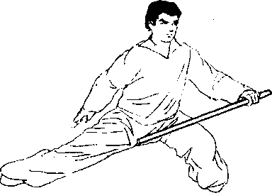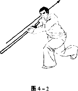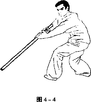 在演练时不但要左右手轮换进行,而且要带活步演练。所谓 活步,就是进退、闪摆、忽左、忽右、忽上、忽下的进行,会充 实鞭杆的技击内容及实用价值。(图4-1~4-4)