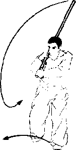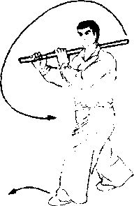 顺势右步蹬伸,身体重心左移的 同时,身体向左拧转,左手顺势回握鞭梢,借身体左拧转之力, 左臂顺势向左侧前翻腕,外鼠平抡至左侧前,鞭与胸平。势