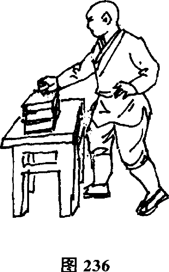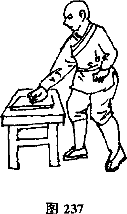 砖石功是拳功的关键,俗语说“有志者事竟成,无志者万事 空J练到这种地步一定要持之以恒,否则,几年之功即刻毁于一 旦。先取一块红砖平放在结实的桌凳上,练功者以弓步站好,然 后调息沉气蓄劲,气贯双拳。以爆发内劲劈砸红砖,同时身体重 心随之下降发声助力(图236)。至拳到褥碎后,逐渐增加砖数,练 至一拳击下5块红砖皆碎,则改为砸石板(图237)。每日两次,每 次百余发,依法练习,三年即可拳落石板碎。