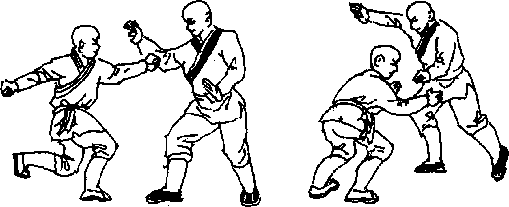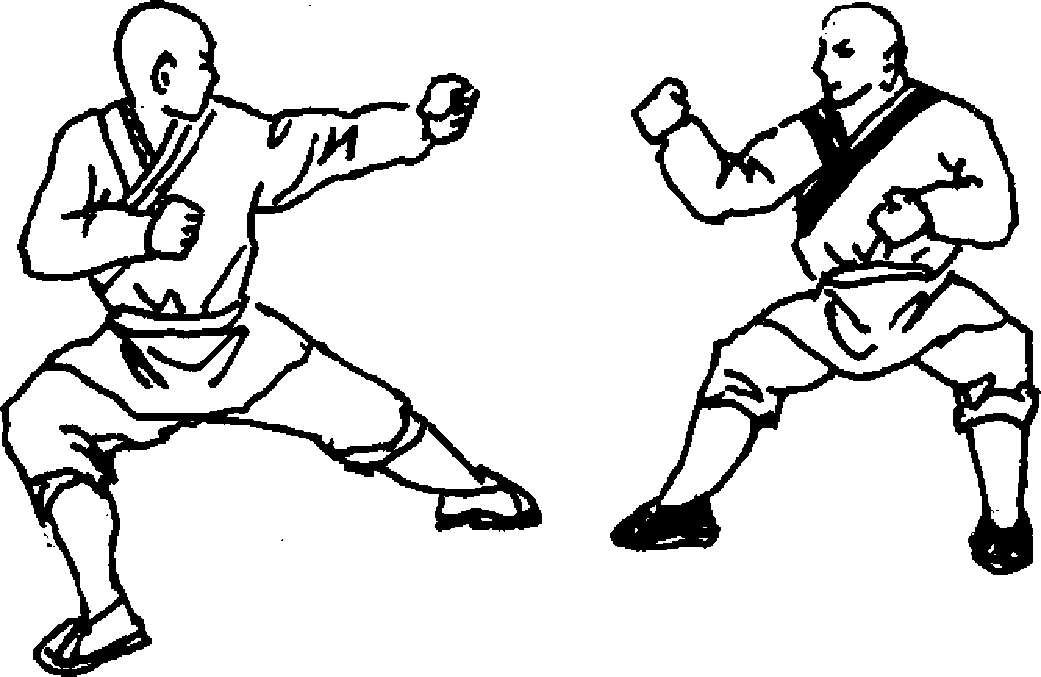 设想:敌我双方对视(图244)。我左脚向前上一步,右脚紧随 上一步,同时,以左手向敌人面前虚晃一拳(图251)。随即右拳从 下向上捞打敌裆部(图252)。