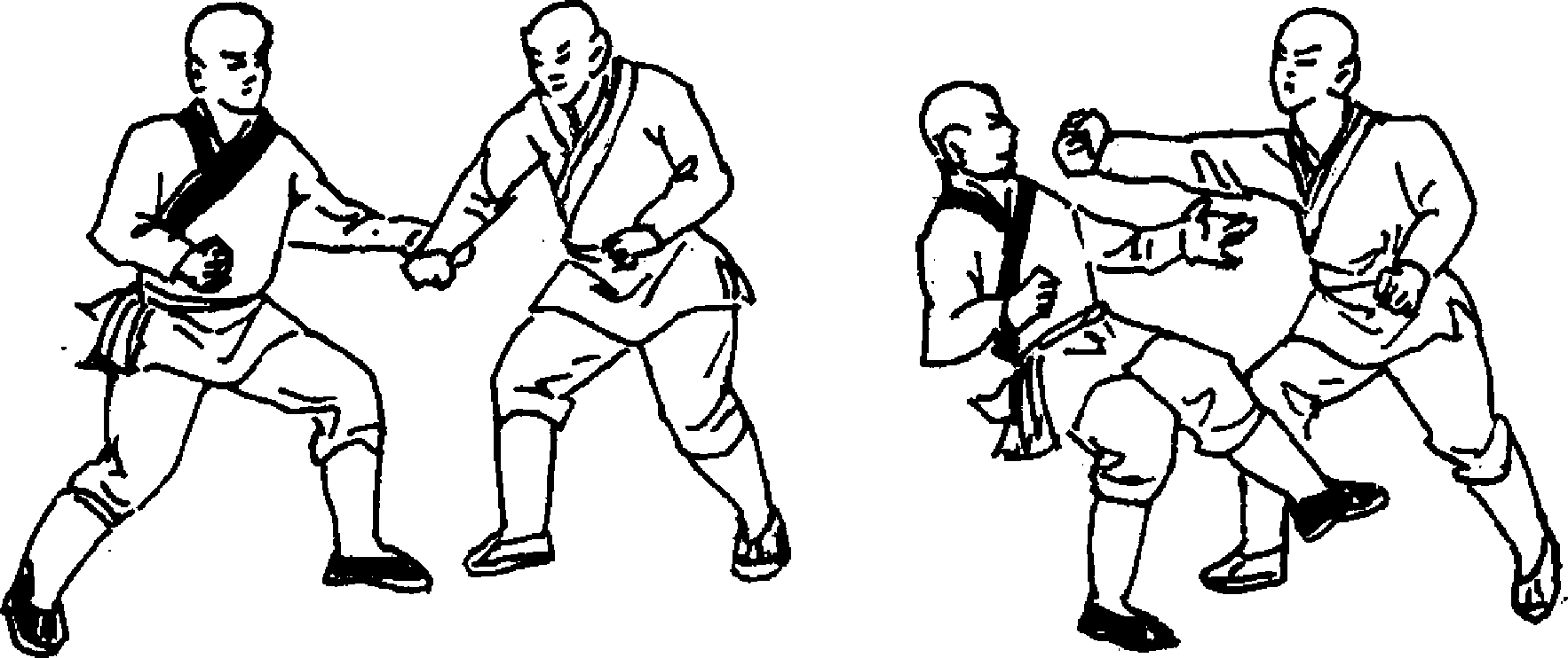 设想:敌我双方对视(图244)。敌用右手冲拳向我头部打来, 我左手迅速从内向外刁抓敌右手腕,并用力向怀里带拉(图245)。 同时,我右手从腰间向前冲打敌肋部(图246)。
