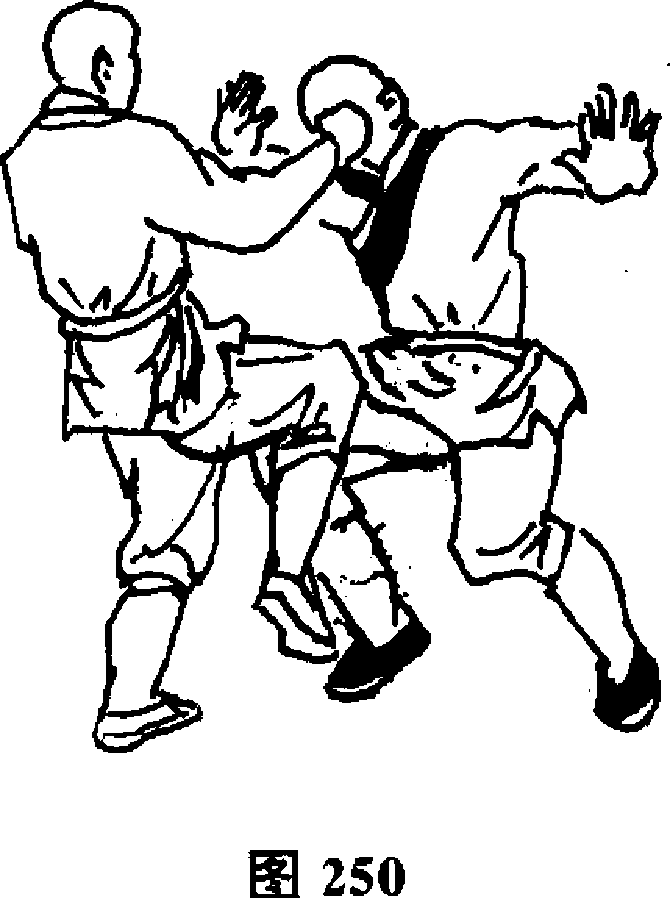 右膝向前顶击敌裆,同时,以右手从上向下劈击敌头顶(图250)
