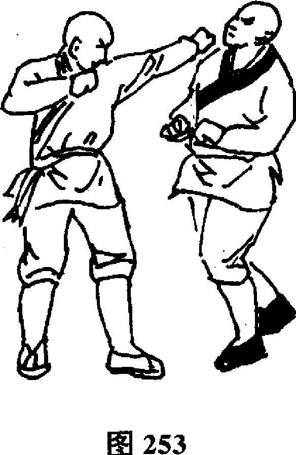 设想:敌我双方对视(图244) °我以左手向敌人面部虚打一拳 253)。随即右拳向前迅速猛击敌面部(图254)。