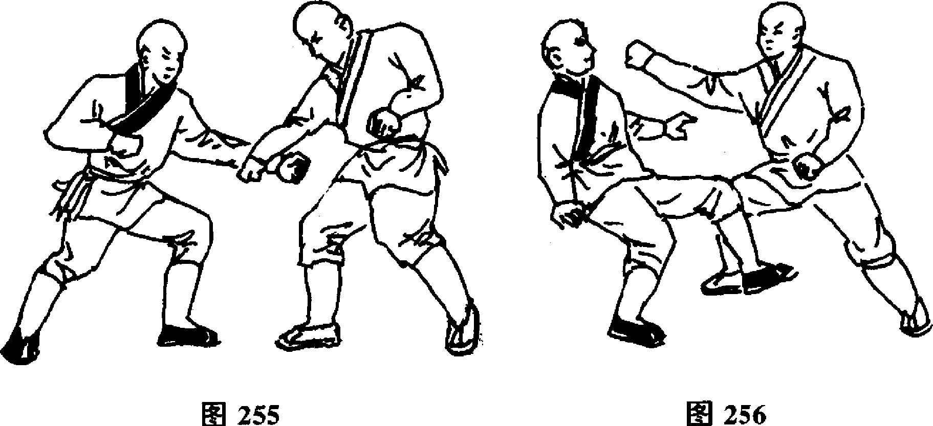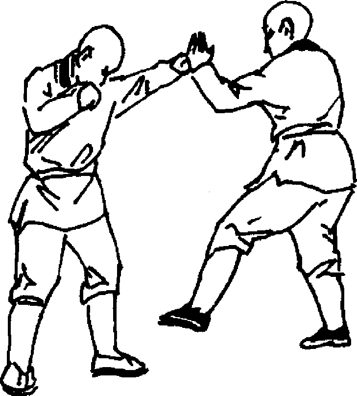 设想:敌我双方对视(图244)o敌以左手向我腹部打来,我以 右手迅速从内向外拨开敌左拳(图255)。随即右脚向前上步,右拳