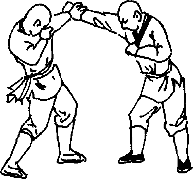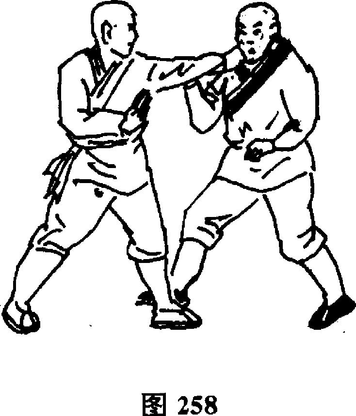 设想:敌我双方对视(图244)。敌以右手冲拳向我头部打来, 我左手迅速从内向外刁抓敌手腕(图261)。随即两脚用力蹬地使
