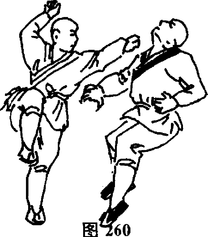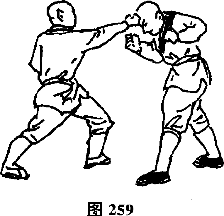 259)。随即右脚向前提起,左拳向前冲打敌下颔(图260)。