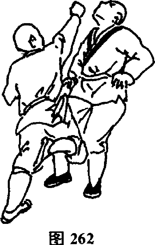 身体腾空,同时,以右拳向敌面部砸去(图262)。