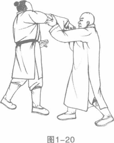 按于肘节正面之骨缝中用力拿之。如欲擒拿其右肘则两手互易位置行之可也。(图1-20)