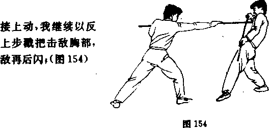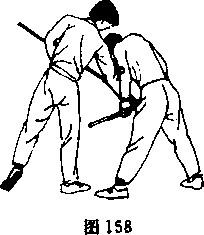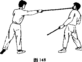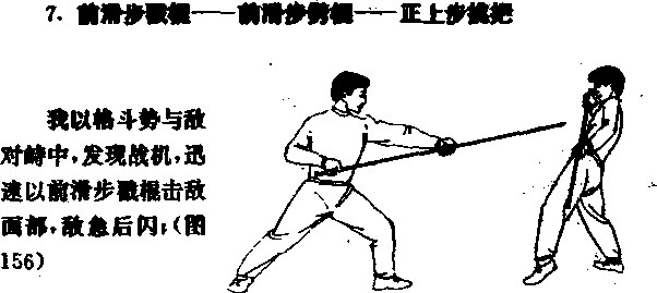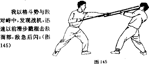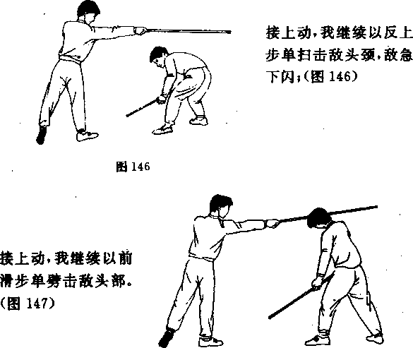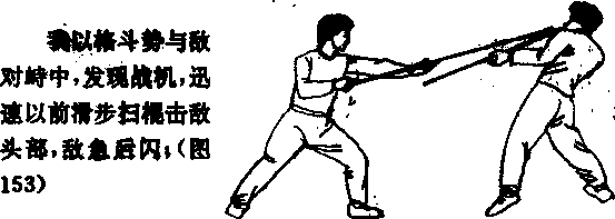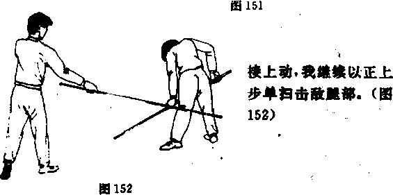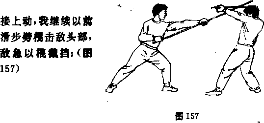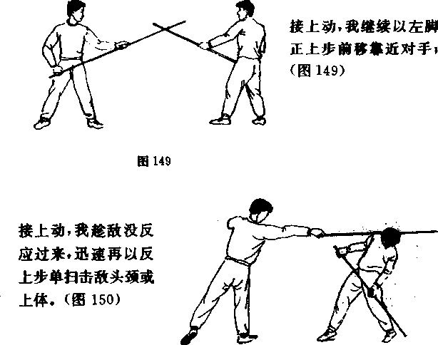 图4正上步单戳——正上步一反上步单扫我以格斗势与敌对峙中发现战机迅速以正上步单戴击敌面部敌急后闪(图148)5前清步朔正上步单招我以格斗势与敌对峙中爱现战机迅速以前清步劈棍击敌头部敌急后闪图151)田扫1一反上步——正上岁抖瓢接上动我继续以正上步扫棍击敌头颈或上体108155)155接上动我继续以正上步挑把击敌裆部(图158)