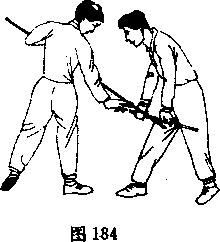 接上动我继续以正上步挑把击敌档部,敌急以棍截挡(图184)