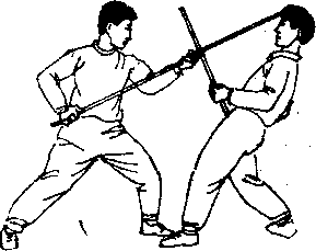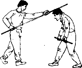 我以格斗势与敌对峙中发现战机迅速以前滑步拂棍击敌裆部敌急撤步后闪(图183)