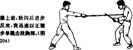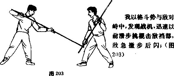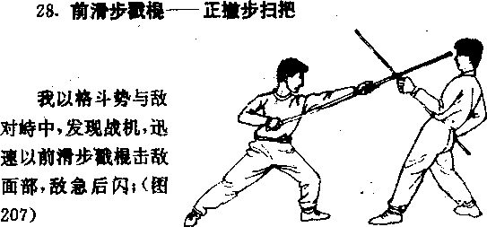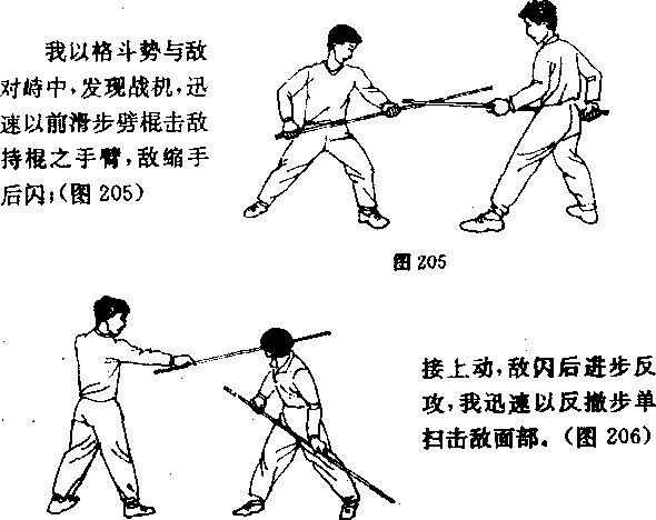 2九前滑步劈棍一反撇步单扫图206接上动敌闪后进步反攻我迅速再以正撇步扫把击敌头颈。(图208)图208图20929前清步事根一外内州星图20929前清步事根一外内州星我以格斗势与敌对峙中发现盘机迅速以前滑步裁棍击敌面部敌急截挡图209)接上动我迅速再以外闪劈棍击敌头肩(图210)