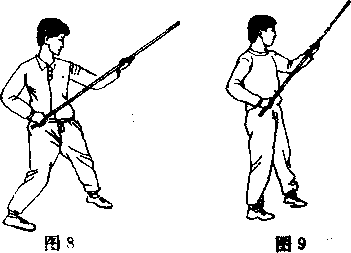 从格斗势开始,前脚蹬地,后脚跟外转向内后侧方向或内侧方向退步然后前脚脚跟内转迅速跟退仍保持格斗势状态目视前方。(图8、9)