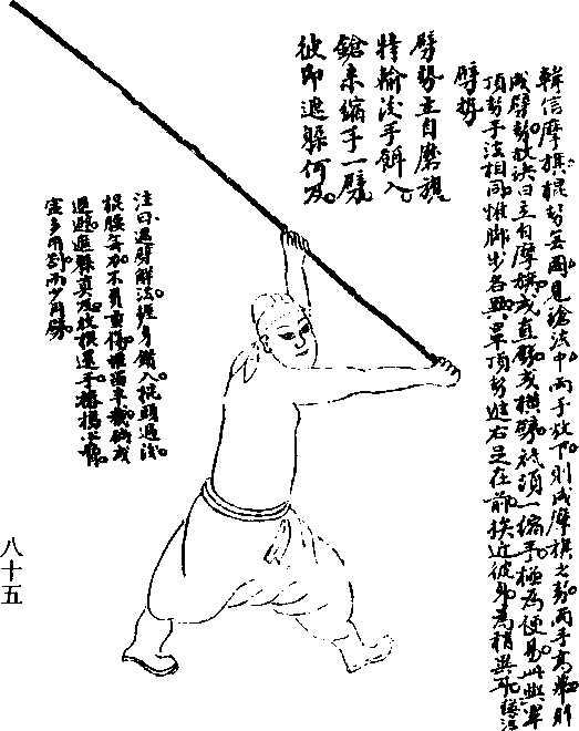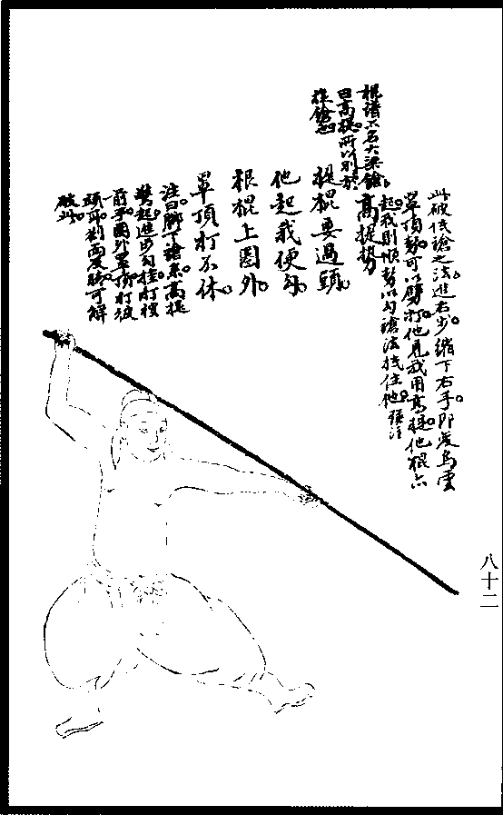 注曰:高棍来, 圈外用阴手推开。 低棍去,圈里用阳 手缠住。上可打脑 头,下可二拦收,进 则锁口封喉,退则 劄脚削手。若问解 法,仍自低求,潜龙 伏虎,地蛇铁牛。