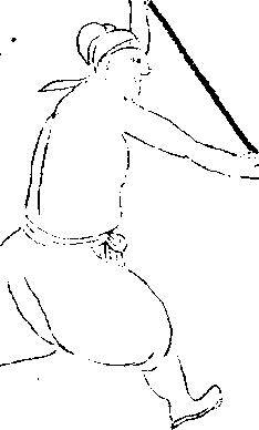 彼劄我圈外, 我勾开彼棍,立雁 翅势,偏在圈外。倘 彼进步锁我口,我 搠起彼棍,下打彼 膝脚,再变他势。