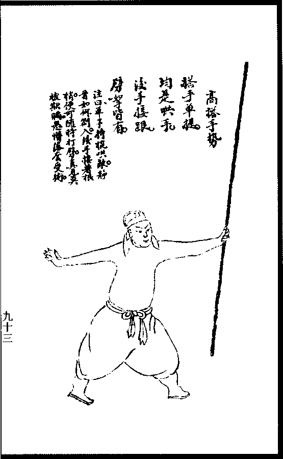 此与高搭手二 势,俱是开门诱敌 之法。佯作虚枪,哄 彼劄来,接着手便 可应之。